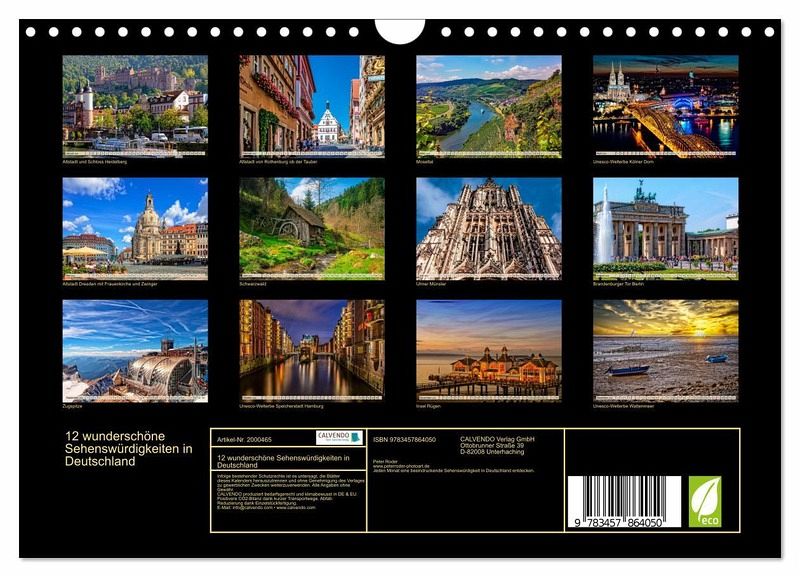 Angesagte Städte, wunderschöne Plätze und einzigartige Landschaften, die touristisch zu den beliebtesten in Deutschland gehören und jedes Jahr neue Besucherrekorde verzeichnen können. Für diesen Kalender hat der Fotokünstler Peter Roder zwölf wunderschöne Aufnahmen beeindruckender Sehenswürdigkeiten zusammengestellt und gestaltet, ein farbenprächtiger Hingucker für das ganze Jahr.