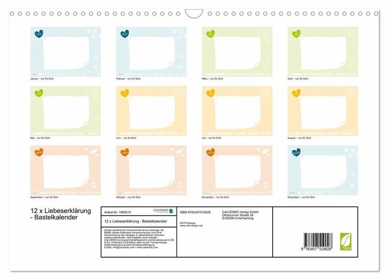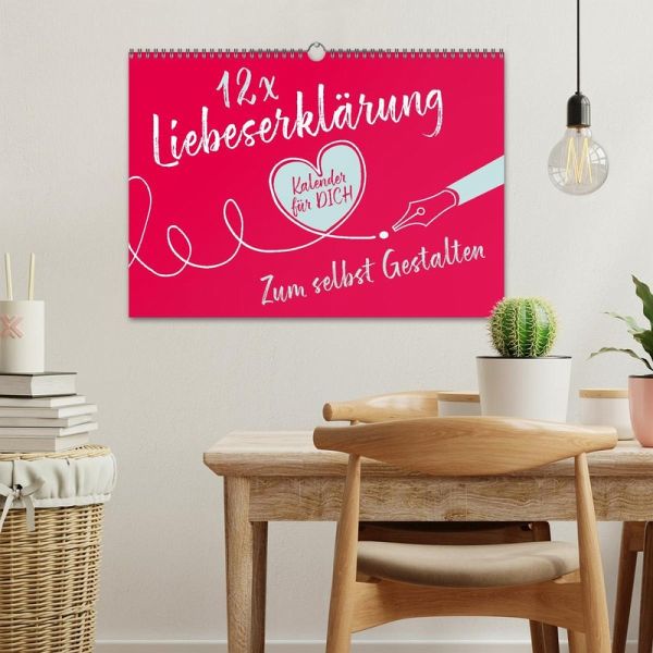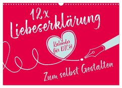 Dieser Kalender ist ein sehr liebevolles Geschenk, das wirklich von Herzen kommt. Zum Hochzeitstag, Jahrestag, Geburtstag, Muttertag, Vatertag oder auch einfach so ...Viel Persönliches wird über sms und Emojis in Handys getippt. Da ist dieser Kalender eine schöne Gelegenheit, eine kleine Auszeit davon zu nehmen und Gefühle auf klassische Art für einen besonderen Menschen mit eigener Handschrift auszudrücken.HINWEIS:Für die 12 weißen Textfelder auf den Kalenderblättern bitte Extra-Papier zum Beschriften & Gestalten verwenden, da das Druckpapier des Kalenders selbst sehr glatt ist und z. B. Buntstifte, Bleistift, normale Filzstifte etc. dann besser haften. UND SO GEHT'S:Tonpapier, Briefpapier oder auch schlichtes weißes Papier in 12 für die weißen Textfelder passenden Rechtecke schneiden, beschriften und ggf. mit Zeichnungen gestalten.Besonders schön sieht die Schrift mit einem Kalligrafie-Stift oder farbigen Fineliner aus. Es gibt natürlich noch viele andere Gestaltungsmöglichkeiten. Die 12 fertig gestalteten "Liebeserklärungen" einfach in den Kalender eingekleben. Evtl. noch Fotos, etc. dazu kleben.Auf jedem Kalenderblatt ist Platz für ein Kompliment, einen schönen Spruch, eine Anekdote, ein liebevolles Necken oder auch Erinnerung an gemeinsame Erlebnisse ... Die Möglichkeiten sind hier grenzenlos.Wer so ein besonderes Geschenk erhält, wird über ein ganzes Jahr und auch länger unendlich Freude daran haben. Garantiert.Wir wünschen viel Spaß bei der Gestaltung und wunderbare Momente beim Auspacken dieses Geschenk-Kalenders.