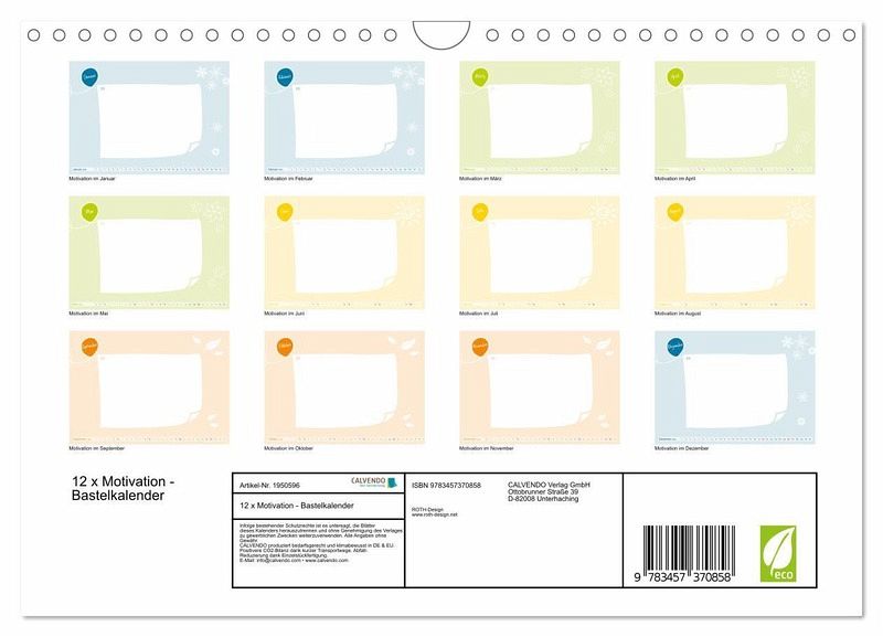 Schenken Sie sich selbst oder einem lieben Menschen 12 Monate Inspiration zur Selbstmotivation. Ein geeigneter Platz ist z.B. als Tischkalender auf Ihrem Schreibtisch oder als Wandkalender an einer Stelle an der Wand, an der Sie oft vorbeigehen. Von DIN A5 - DIN A2 können Sie jedes beliebige Format wählen.HINWEIS:Bitte beachten Sie, dass das Druckpapier des Kalenders für Buntstifte, Bleistift, normale Filzstifte usw. nicht geeignet ist, da diese abperlen. UND SO GEHT'S:Tonpapier, Briefpapier oder auch schlichtes weißes Papier in 12 für die weißen Textfelder passenden Rechtecke schneiden, beschriften und ggf. mit Zeichnungen gestalten.Besonders schön sieht die Schrift mit einem Kalligrafie-Stift oder farbigen Fineliner aus. Es gibt natürlich noch viele andere Gestaltungsmöglichkeiten. Die 12 fertig gestalteten Motivations-Bögen anschließend einfach in den Kalender einkleben. Evtl. noch Fotos, Illustrationen etc. dazu kleben.Auf jedem Kalenderblatt ist Platz für einen tiefgründigenSpruch, einen selbstverfassten Text oder Reim ... Die Möglichkeiten sind hier grenzenlos.Schenken Sie sich einfach selbst etwas oder verschenken Sie den Kalender. Wer so ein besonderes Geschenk erhält, wird über ein ganzes Jahr und auch länger Freude daran haben. Garantiert.Wir wünschen viel Spaß bei der Gestaltung und schöne Momente beim Auspacken dieses Geschenk-Kalenders.