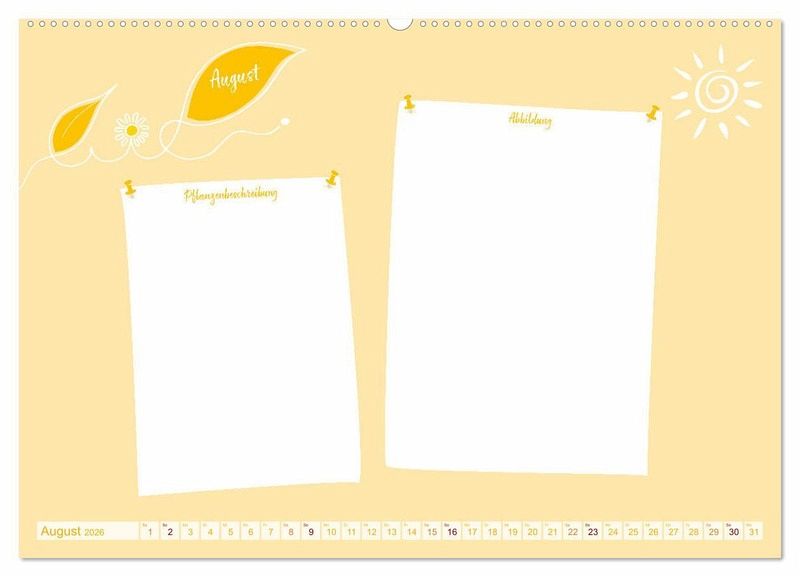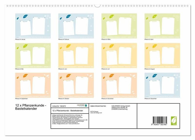 Gestalten Sie Ihren persönlichen Pflanzenkalender. Für jeden Monat eine Pflanze mit Beschreibung und Foto einfach auf die dafür vorgesehenen weißen Flächen einkleben. Auch ist dieser Kalender eine schöne Möglichkeit z.B. für die Schule um etwas Abwechslung in den Biologieunterricht oder Kunstkurs zu bringen, die den Schülerinnen und Schülern gewiss viel Spass macht und dafür sorgt, dass die Beschreibungen sich besser einprägen. Ein geeigneter Platz ist z.B. als Tischkalender für den Schreibtisch oder als Wandkalender. Von DIN A5 - DIN A2 können Sie jedes beliebige Format wählen.UND SO GEHT'S:Wählen Sie schöne Pflanzenfotos aus oder machen auf Wanderungen selbst Fotos. Dazu können Sie auf farbigen Tonkarton oder auch schlichtem weißen Papier selbst eine Beschreibung verfassen oder auch kopieren und einkleben ... Die Möglichkeiten sind hier sehr vielseitig.HINWEIS:Bitte beachten Sie, dass das Druckpapier des Kalenders für Buntstifte, Bleistifte, normale Filzstifte u.s.w. nicht geeignet ist, da diese abperlen. TIPP: Verwenden Sie z.B. unterschiedliche Farben für das Papier für die Pflanzenbeschreibung auf der linken Seite. So wird es ein fröhlicher Naturkalender ganz individuell gestaltet.Dieser Kalender ist auch sehr gut als Geschenk geeignet z.B. zu Weihnachten oder zum Geburtstag. Wer so ein besonderes Geschenk erhält, wird über ein ganzes Jahr Freude daran haben und sich vielleicht sogar entscheiden, im folgenden Jahr einen weiteren Pflanzenkalender zu gestalten.Wir wünschen viel Spaß bei der Gestaltung und schöne Momente beim Auspacken dieses einzigartigen Geschenk-Kalenders.