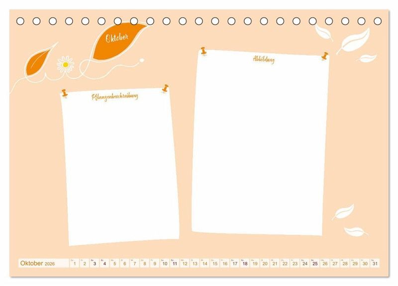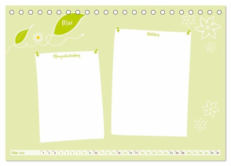 Gestalten Sie Ihren persönlichen Pflanzenkalender. Für jeden Monat eine Pflanze mit Beschreibung und Foto einfach auf die dafür vorgesehenen weißen Flächen einkleben. Auch ist dieser Kalender eine schöne Möglichkeit z.B. für die Schule um etwas Abwechslung in den Biologieunterricht oder Kunstkurs zu bringen, die den Schülerinnen und Schülern gewiss viel Spass macht und dafür sorgt, dass die Beschreibungen sich besser einprägen. Ein geeigneter Platz ist z.B. als Tischkalender für den Schreibtisch oder als Wandkalender. Von DIN A5 - DIN A2 können Sie jedes beliebige Format wählen.UND SO GEHT'S:Wählen Sie schöne Pflanzenfotos aus oder machen auf Wanderungen selbst Fotos. Dazu können Sie auf farbigen Tonkarton oder auch schlichtem weißen Papier selbst eine Beschreibung verfassen oder auch kopieren und einkleben ... Die Möglichkeiten sind hier sehr vielseitig.HINWEIS:Bitte beachten Sie, dass das Druckpapier des Kalenders für Buntstifte, Bleistifte, normale Filzstifte u.s.w. nicht geeignet ist, da diese abperlen. TIPP: Verwenden Sie z.B. unterschiedliche Farben für das Papier für die Pflanzenbeschreibung auf der linken Seite. So wird es ein fröhlicher Naturkalender ganz individuell gestaltet.Dieser Kalender ist auch sehr gut als Geschenk geeignet z.B. zu Weihnachten oder zum Geburtstag. Wer so ein besonderes Geschenk erhält, wird über ein ganzes Jahr Freude daran haben und sich vielleicht sogar entscheiden, im folgenden Jahr einen weiteren Pflanzenkalender zu gestalten.Wir wünschen viel Spaß bei der Gestaltung und schöne Momente beim Auspacken dieses einzigartigen Geschenk-Kalenders.