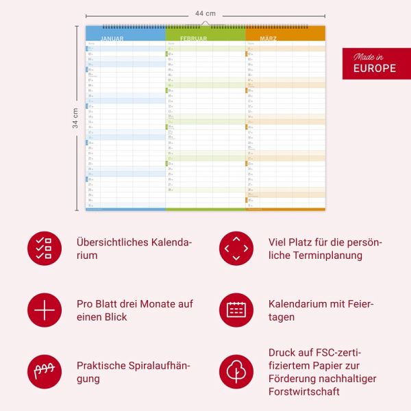 - Klares Layout für optimalen Überblick: 3-Monats-Wandkalender 2026 - Besser als Termin-Wirrwarr: Farblich abgegrenzte Organisationshilfe - Terminkalender mit 4 Spalten und einem Blatt pro Quartal- Nicht nur nützlich, sondern auch ein Hingucker: Kalender für Familien im Format 44 x 34 cm - Das Design macht den Unterschied: Großer Dreimonatskalender mit viel Platz für Termine und Eintragungen- Praktische Planer für die gesamte Familie: Die Kalender von Heye aus dem Athesia Kalenderverlag