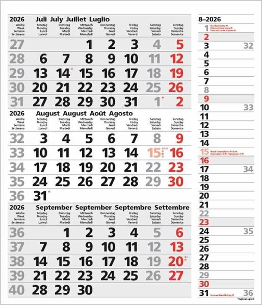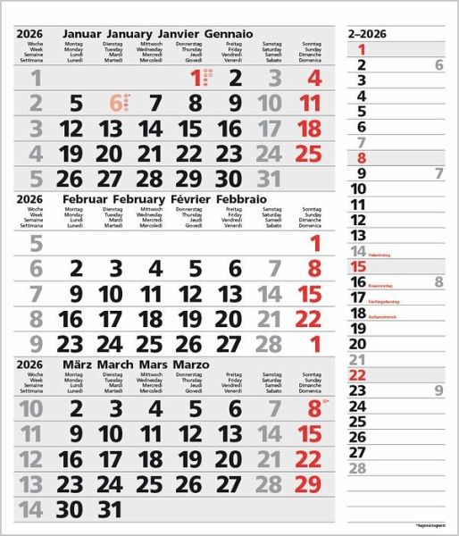 1 Seite 3 Monate im überblick; umweltfreundliches FSC Papier. Extra Streifentimer zum eintragen von Urlaub oder Terminen. Kalendarium auf D/E/F/I mit farblich hervorgehobenen Feiertagen für Deutschland, Österreich und Schweiz. Praktische Perforierung zum einfachen Abtrennen der Seiten. Mit Datumsschieber