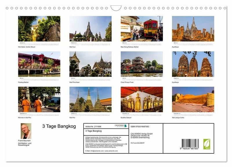 QUALITÄT - Hochwertiger Fotokalender mit 12 wunderschönen Motiven auf lichtbeständigem Bilderdruckpapier, robuste Spiralbindung mit Aufhängebügel.NACHHALTIG - deutliche Abfallreduzierung durch bedarfsgerechte Einzelstückfertigung, umweltfreundliches FSC-zertifiziertes Papier, Produktion in Deutschland, klimabewusste Logistik.PERFEKTES GESCHENK - Kalender für Freunde und Familie, für Kinder und Erwachsene, jung und alt, zu Weihnachten, Geburtstag oder zwischendurch.VIELFALT - Bildkalender in verschiedenen Formaten, z.B. DIN A5, DIN A4, DIN A3 sowie DIN A2. Ob Naturmotiv, Gemälde oder Fotos, ideal für ein persönliches Wohlfühlambiente.3 Tage Bangkog, 3 Tage Staunen. von Autor(in): FB Frank BAUMERT