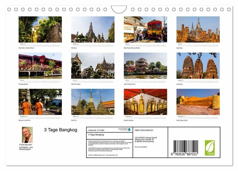 QUALITÄT - Hochwertiger Fotokalender mit 12 wunderschönen Motiven auf lichtbeständigem Bilderdruckpapier, robuste Spiralbindung mit Aufhängebügel.NACHHALTIG - deutliche Abfallreduzierung durch bedarfsgerechte Einzelstückfertigung, umweltfreundliches FSC-zertifiziertes Papier, Produktion in Deutschland, klimabewusste Logistik.PERFEKTES GESCHENK - Kalender für Freunde und Familie, für Kinder und Erwachsene, jung und alt, zu Weihnachten, Geburtstag oder zwischendurch.VIELFALT - Bildkalender in verschiedenen Formaten, z.B. DIN A5, DIN A4, DIN A3 sowie DIN A2. Ob Naturmotiv, Gemälde oder Fotos, ideal für ein persönliches Wohlfühlambiente.3 Tage Bangkog, 3 Tage Staunen. von Autor(in): FB Frank BAUMERT