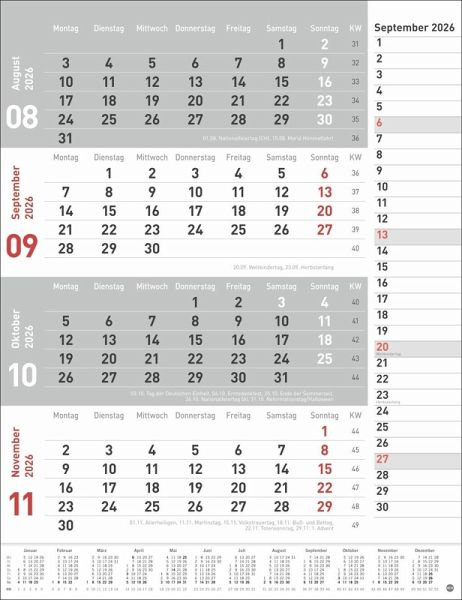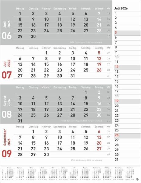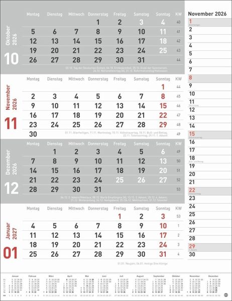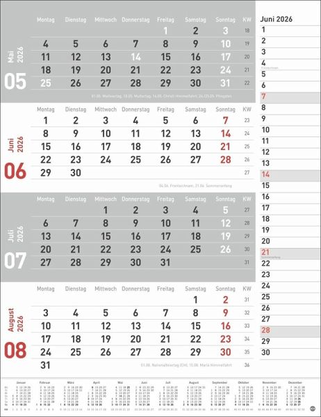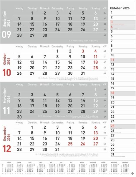 - Neutral, praktisch, übersichtlich: 4-Monats-Terminkalender in schlichtem Design- Alle Deadlines, Meetings und andere Termine im Blick mit diesem Büro-Wandkalender 2026 im Hochformat 30 x 39 cm- Volle Konzentration auf das Wesentliche: 4-Monats-Kombiplaner mit einer Spalte für Notizen und Datumsschieber- Organisationshilfe für Büro und Homeoffice mit Jahresübersicht und farblich abgesetzten Wochenenden und Feiertagen in Rot- Für alle, die das Terminchaos schlicht und einfach im Griff haben wollen: Die neutralen Kalender von Heye im Athesia-Kalenderverlag