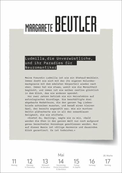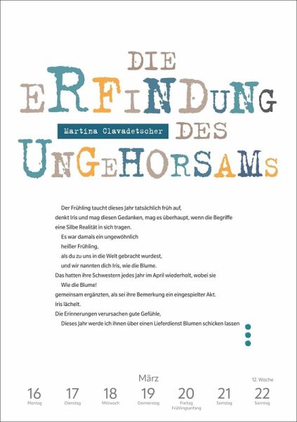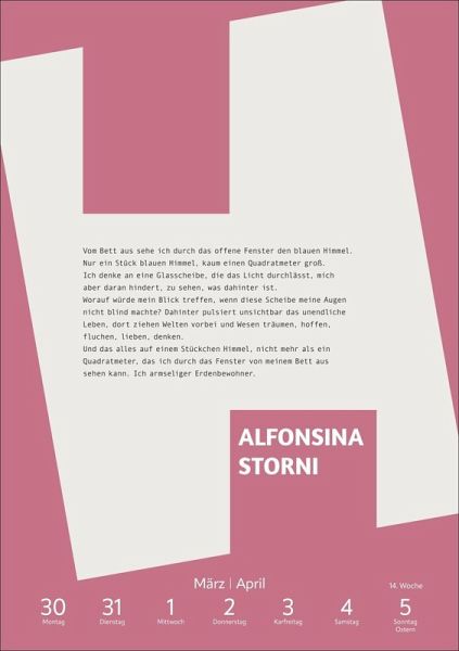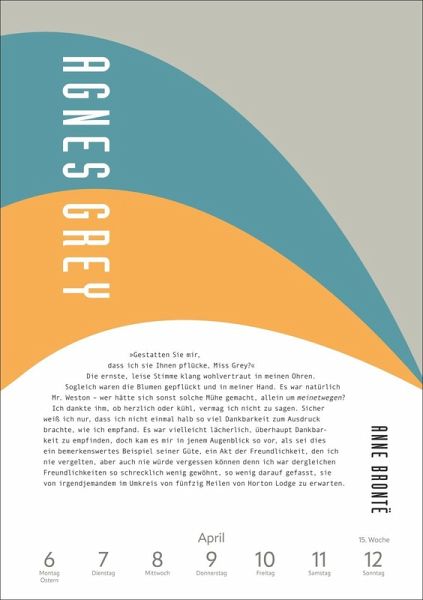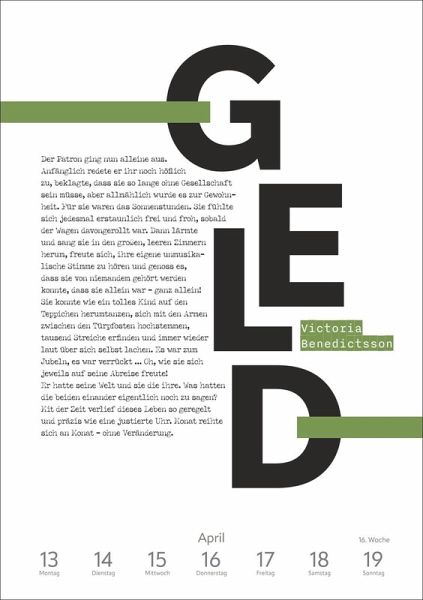 Die einzelnen Wochenblätter sind nicht, wie sonst üblich, mit einer Porträtabbildung ergänzt, sondern mit einer trendigen Grafik-Optik, was dem Zitat noch mehr Ausdruck verleiht. Ein Extrablatt am Kalenderende vermittelt kurze Infos zu den Autorinnen und den Zitatquellen. Fazit: Ein etwas anderer Literaturkalender, der aber viele Lektüreanregungen gibt.