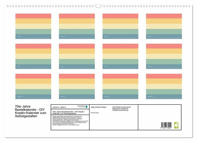 Werde kreativ und bastel dir deinen eigenen "Siebziger Jahre" Kalender im 70er Jahre Farbstil. Vielleicht im Stile des Scrapbookings mit eigenen Fotos, Collagen, Zeichnungen, Sprüchen, Gutscheinen, beeindruckenden Zitaten und/oder deinen eigenen Texten. Oder aber du lässt dir etwas völlig anderes einfallen. Das liegt ganz bei dir!