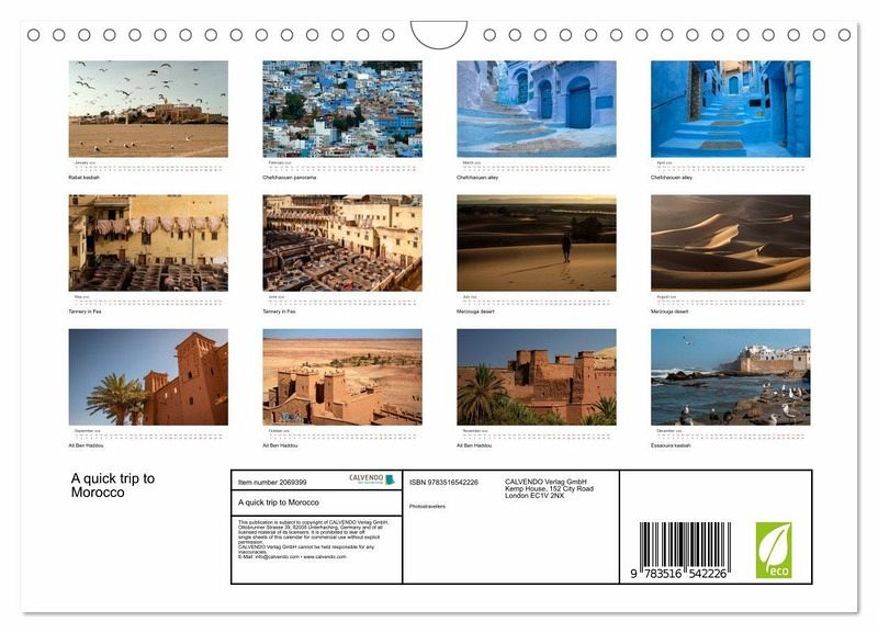 QUALITY - High-quality photo calendar with 12 beautiful images on light-resistant paper, robust spiral binding with hanger.SUSTAINABLE - Significant waste reduction due to print-on-demand production, environmentally friendly FSC-certified paper, produced in the UK, climate-conscious logistical processes.PERFECT GIFT - calendars for friends and family, for children, all ages and all occasions, from Christmas to birthdays and everything in between.LOTS OF CHOICE - Wall calendars in different sizes (DIN A4 and DIN A3), for any topic and personal taste, featuring photography, painting and illustrations.Morocco must see, author: Photostravellers