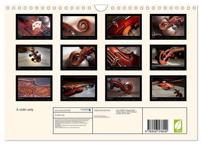 QUALITY - High-quality photo calendar with 12 beautiful images on light-resistant paper, robust spiral binding with hanger.SUSTAINABLE - Significant waste reduction due to print-on-demand production, environmentally friendly FSC-certified paper, produced in the UK, climate-conscious logistical processes.PERFECT GIFT - calendars for friends and family, for children, all ages and all occasions, from Christmas to birthdays and everything in between.LOTS OF CHOICE - Wall calendars in different sizes (DIN A4 and DIN A3), for any topic and personal taste, featuring photography, painting and illustrations.Thirteen wonderful photos of a violin. For those who love this beautiful instrument, author: Christiane Calmbacher