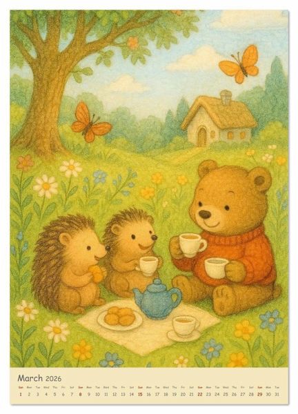 This calendar takes you into lovingly designed animal worlds full of cosiness, warmth and childlike imagination. Whether it's a fox in the snowy light, a mouse in a forest library or two bunnies snacking on strawberries, each picture tells its own little story. The motifs were created with the help of artificial intelligence in the style of traditional illustrations and carefully harmonised with each other. They combine modern technology with nostalgic charm and are perfect for anyone who loves a cosy, cuddly and fairytale-like atmosphere. Ideal as a gift or for your own home, for a year full of warmth. An AI calendar for dreaming, marvelling and snuggling up.
