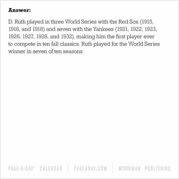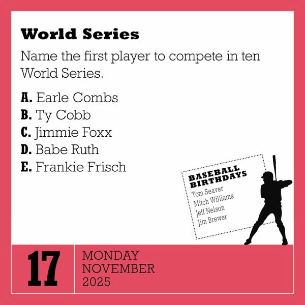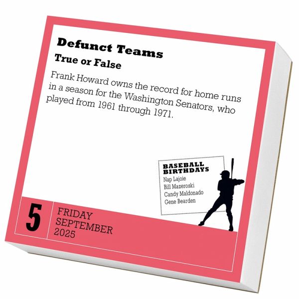 Spend a year at the ballpark with 365 days of trivia, stats, and immortal records for the baseball fan. * BASEBALL FUN: Here's everything you love about the game, right on your desktop every day of the year: Hall of Famers, Famous Firsts, Immortal Records, Dubious Distinctions, quotes, and more. * HOME RUN GIFT: Trivia fans and stat geeks will love testing their knowledge with this collection of fascinating factoids from the author of The Major League Baseball Book of Fabulous Facts and Awesome Trivia. * PLASTIC FREE: Printed on responsibly sourced paper and 100% recyclable.