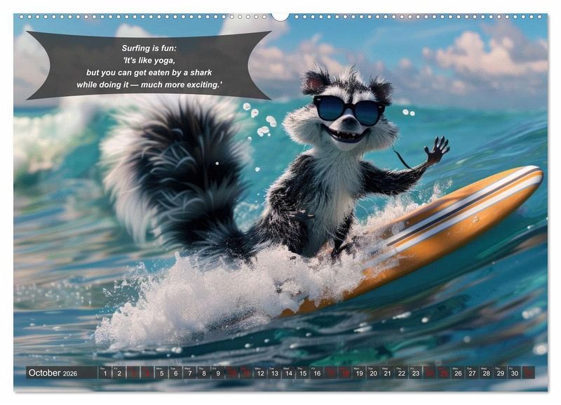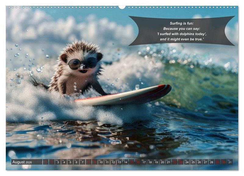 PREMIUM COLLECTION - Brilliant photo calendar with 12 beautiful motifs, high-gloss art print in museum quality.QUALITY - high-quality materials, sturdy back cover with 2 innovative insert pockets for optimum presentation on the wall.SUSTAINABLE - significant reduction in waste thanks to customised one-off production, environmentally friendly FSC-certified paper, production in Germany, climate-conscious logistics.PERFECT GIFT - calendars for friends and family, for children and adults, young and old, for Christmas, birthdays or in between.Funny animals in surfer style surf the ocean on a surfboard von Autor(in): Peter Rübsamen