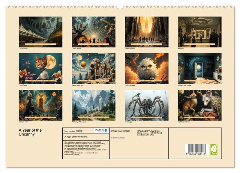 PREMIUM COLLECTION - Brilliant photo calendar with 12 beautiful motifs, high-gloss art print in museum quality.QUALITY - high-quality materials, sturdy back cover with 2 innovative insert pockets for optimum presentation on the wall.SUSTAINABLE - significant reduction in waste thanks to customised one-off production, environmentally friendly FSC-certified paper, production in Germany, climate-conscious logistics.PERFECT GIFT - calendars for friends and family, for children and adults, young and old, for Christmas, birthdays or in between.Surreal and Bizarre Visions von Autor(in): Christine aka stine1