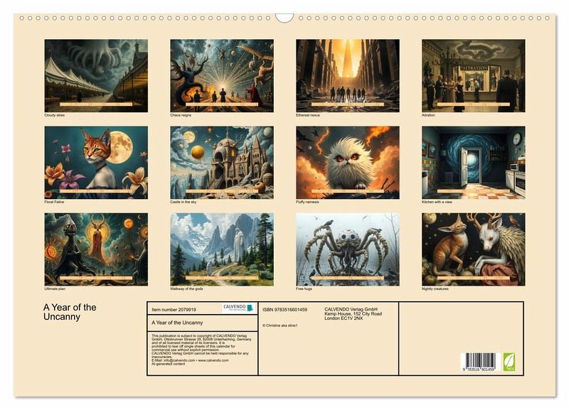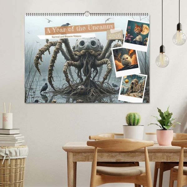 QUALITY - High-quality photo calendar with 12 beautiful images on light-resistant paper, robust spiral binding with hanger.SUSTAINABLE - Significant waste reduction due to print-on-demand production, environmentally friendly FSC-certified paper, produced in the UK, climate-conscious logistical processes.PERFECT GIFT - calendars for friends and family, for children, all ages and all occasions, from Christmas to birthdays and everything in between.LOTS OF CHOICE - Wall calendars in different sizes (DIN A4 and DIN A3), for any topic and personal taste, featuring photography, painting and illustrations.Surreal and Bizarre Visions, author: Christine aka stine1