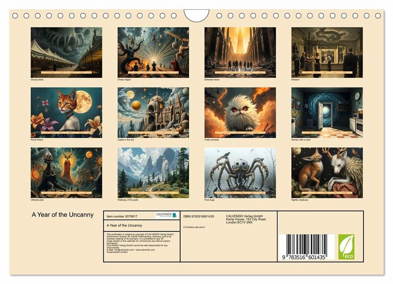 QUALITY - High-quality photo calendar with 12 beautiful images on light-resistant paper, robust spiral binding with hanger.SUSTAINABLE - Significant waste reduction due to print-on-demand production, environmentally friendly FSC-certified paper, produced in the UK, climate-conscious logistical processes.PERFECT GIFT - calendars for friends and family, for children, all ages and all occasions, from Christmas to birthdays and everything in between.LOTS OF CHOICE - Wall calendars in different sizes (DIN A4 and DIN A3), for any topic and personal taste, featuring photography, painting and illustrations.Surreal and Bizarre Visions, author: Christine aka stine1