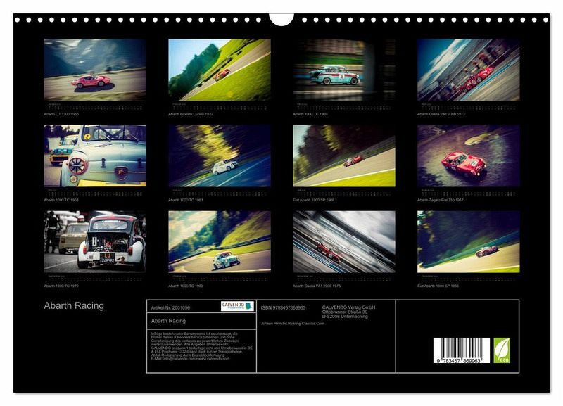 Zwölf aufregende Fotos von Rennfahrzeugen des Carlo Abarth finden sich in diesem Kalender von Johann Hinrichs. Darunter sowohl einige sehr seltene Exemplare, als auch die bekannteren Rennsemmeln im Fiat-Gewand. Ein Muss für jeden Abarth-Freund!