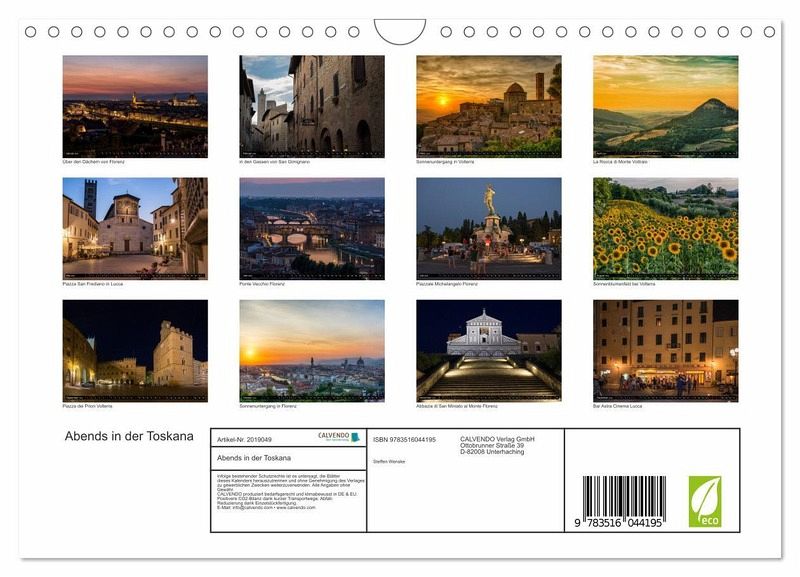 QUALITÄT - Hochwertiger Fotokalender mit 12 wunderschönen Motiven auf lichtbeständigem Bilderdruckpapier, robuste Spiralbindung mit Aufhängebügel.NACHHALTIG - deutliche Abfallreduzierung durch bedarfsgerechte Einzelstückfertigung, umweltfreundliches FSC-zertifiziertes Papier, Produktion in Deutschland, klimabewusste Logistik.PERFEKTES GESCHENK - Kalender für Freunde und Familie, für Kinder und Erwachsene, jung und alt, zu Weihnachten, Geburtstag oder zwischendurch.VIELFALT - Bildkalender in verschiedenen Formaten, z.B. DIN A5, DIN A4, DIN A3 sowie DIN A2. Ob Naturmotiv, Gemälde oder Fotos, ideal für ein persönliches Wohlfühlambiente.Impressionen von Landschaften und Städten der Toskana am Abend von Autor(in): Steffen Wenske