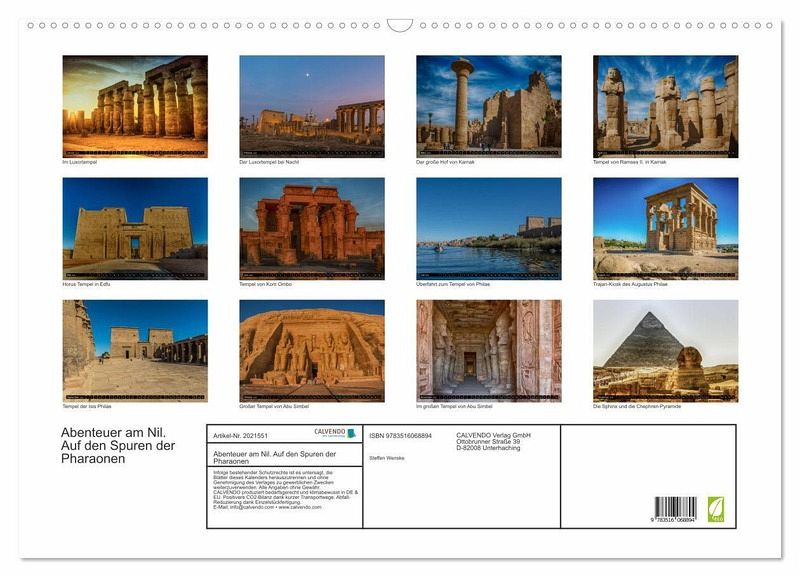 QUALITÄT - Hochwertiger Fotokalender mit 12 wunderschönen Motiven auf lichtbeständigem Bilderdruckpapier, robuste Spiralbindung mit Aufhängebügel.NACHHALTIG - deutliche Abfallreduzierung durch bedarfsgerechte Einzelstückfertigung, umweltfreundliches FSC-zertifiziertes Papier, Produktion in Deutschland, klimabewusste Logistik.PERFEKTES GESCHENK - Kalender für Freunde und Familie, für Kinder und Erwachsene, jung und alt, zu Weihnachten, Geburtstag oder zwischendurch.VIELFALT - Bildkalender in verschiedenen Formaten, z.B. DIN A5, DIN A4, DINA3 sowie DIN A2. Ob Naturmotiv, Gemälde oder Fotos, ideal für ein persönliches Wohlfühlambiente.Impressionen von Tempelanlagen des alten Ägypten von Autor(in): Steffen Wenske