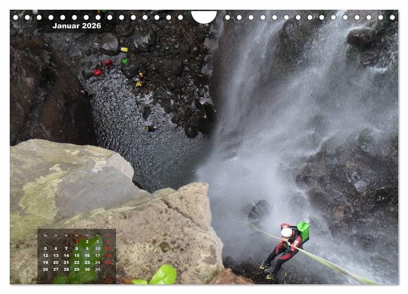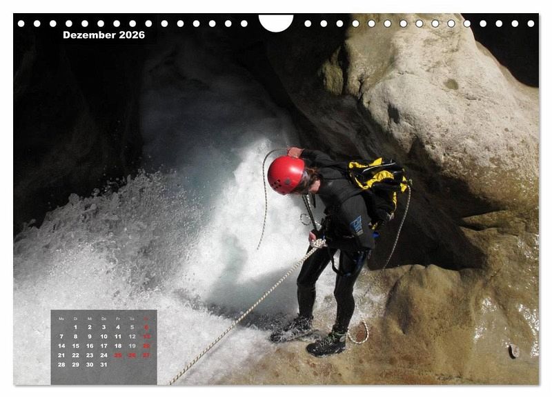 Eng rücken die Felswände zusammen. Das Wasser brodelt, stürzt viele Meter in den Abgrund. Dann wieder Pools, in denen Sonnenstrahlen tanzen und Eidechsen über die Steine huschen. Beim Canyoning folgt man dem Weg des Wassers, das im Laufe von Millionen Jahren enge Klammen und tiefe Schluchten ins Gestein gegraben hat. Nervenkitzel vereint sich mit stillen Naturerlebnissen, scheinbar bekannte Bergregionen werden völlig neu entdeckt. Ein Monatskalender mit faszinierenden Bildern von Canyoning-Touren auf der ganzen Welt.