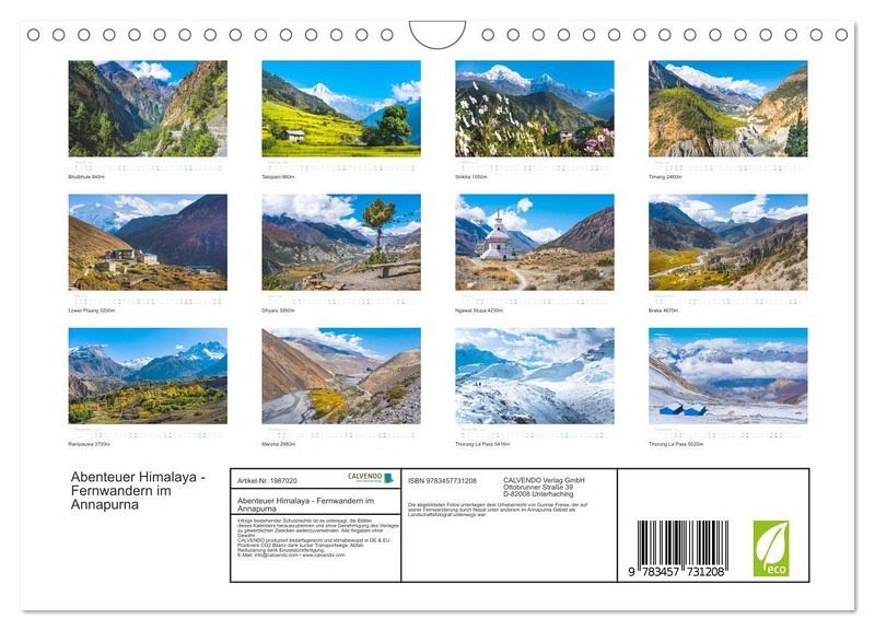 Gehen Sie mit diesem einmaligen Kalender auf eine spannende und aufregende Bilderreise und wandern Sie durch den Himalaya in der Region Annapurna in Nepal. Verschiedenste Vegetationen wie Regenwald über trockene karge Berge bis hin auf den berühmten Thorung La Pass auf 5416m. Die mächtigen Täler berichten aus der Vergangenheit und verzaubern den Betrachter. Lassen Sie sich inspirieren bei der Wanderung durch den Himalaya.