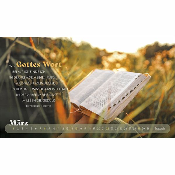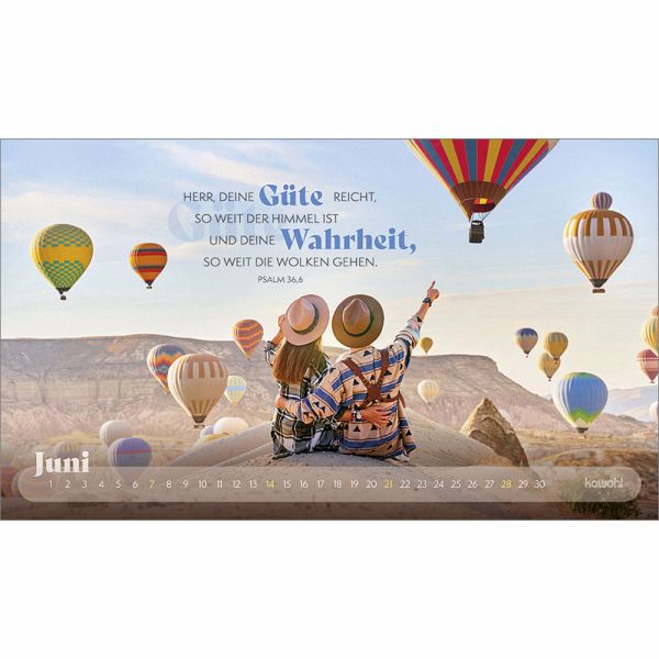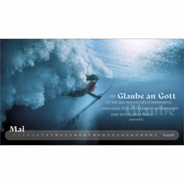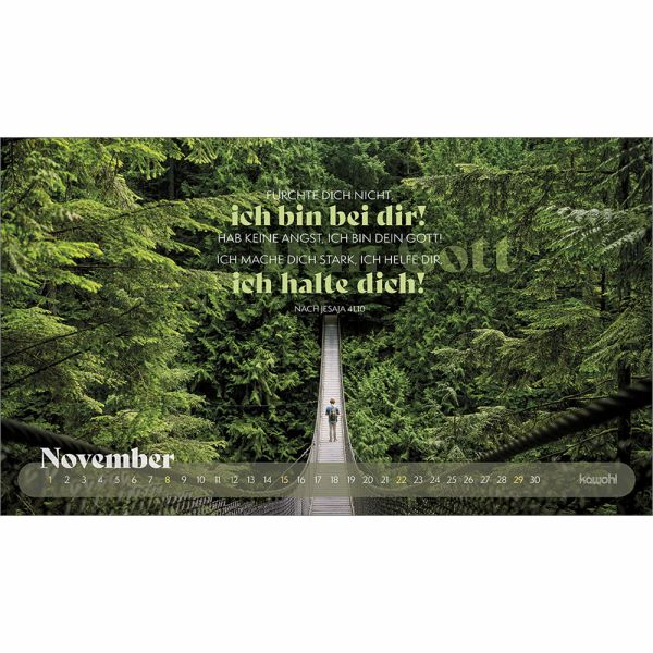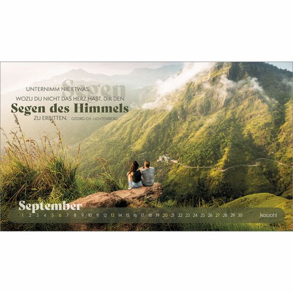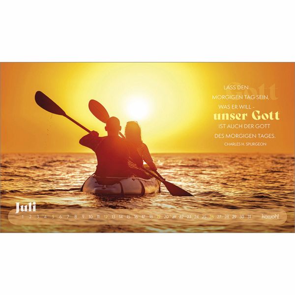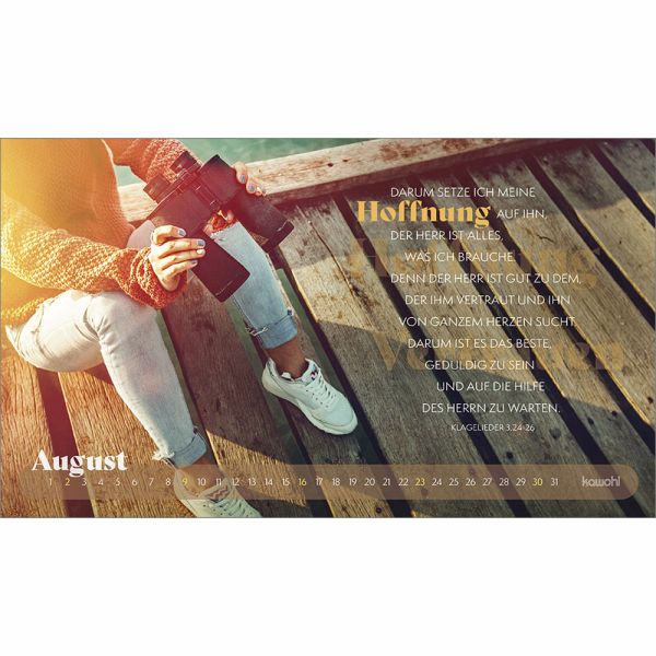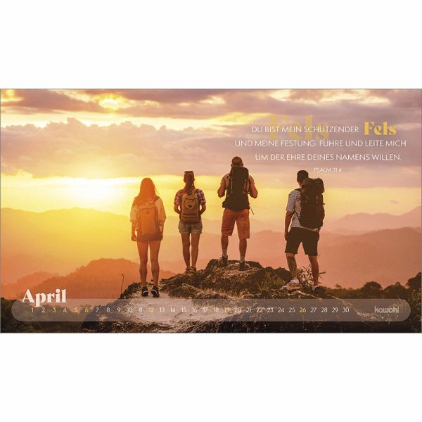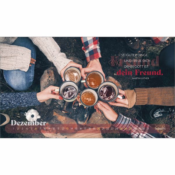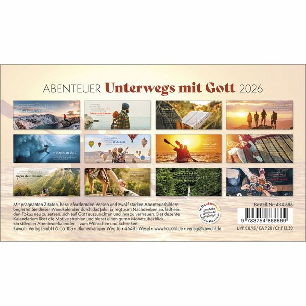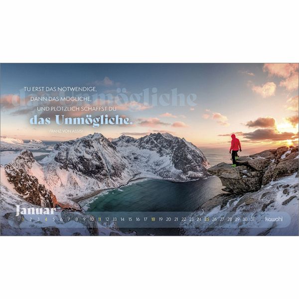 Mit prägnanten Zitaten, herausfordernden Versen und zwölf starken Abenteuerbildern begleitet Sie dieser Postkartenkalender durch das Jahr. Er regt zum Nachdenken an, lädt ein, den Fokus neu zu setzen, sich auf Gott auszurichten und ihm zu vertrauen.Das dezente Kalendarium lässt die Motive strhlen und bietet einen guten Monatsüberblick.Ein stilvoller Abenteuerkalender - zum Wünschen & Schenken.
