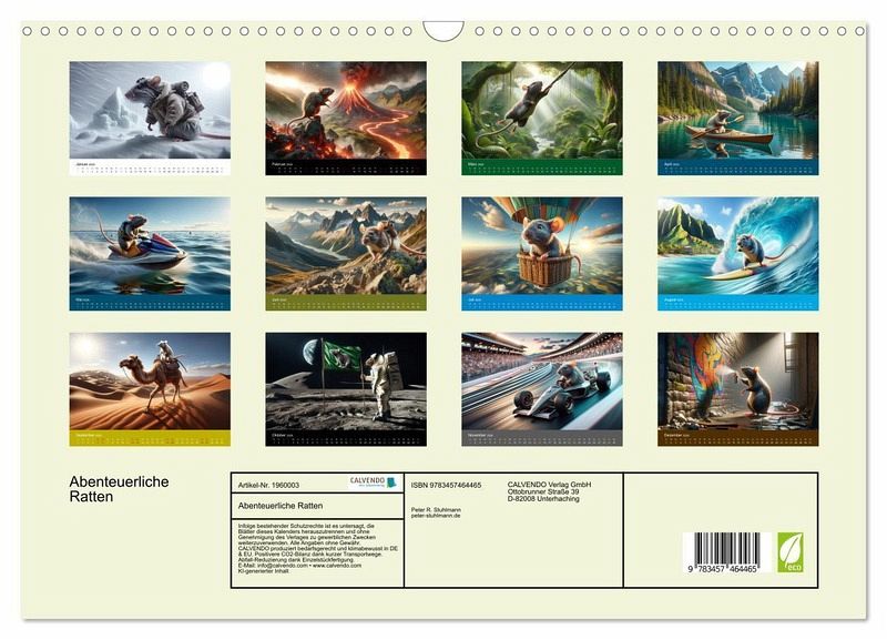 QUALITÄT - Hochwertiger Fotokalender mit 12 wunderschönen Motiven auf lichtbeständigem Bilderdruckpapier, robuste Spiralbindung mit Aufhängebügel.NACHHALTIG - deutliche Abfallreduzierung durch bedarfsgerechte Einzelstückfertigung, umweltfreundliches FSC-zertifiziertes Papier, Produktion in Deutschland, klimabewusste Logistik.PERFEKTES GESCHENK - Kalender für Freunde und Familie, für Kinder und Erwachsene, jung und alt, zu Weihnachten, Geburtstag oder zwischendurch.VIELFALT - Bildkalender in verschiedenen Formaten, z.B. DIN A5, DIN A4, DIN A3 sowie DIN A2. Ob Naturmotiv, Gemälde oder Fotos, ideal für ein persönliches Wohlfühlambiente.Jeden Monat KI-generierte Ratten in abenteuerlichen Szenen von Autor(in): Peter R. Stuhlmann