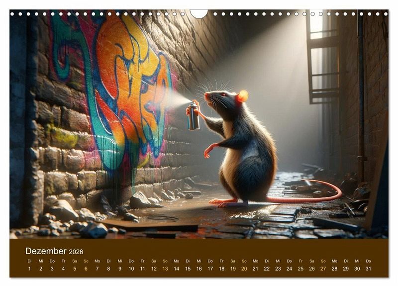 "Abenteuerliche Ratten" - Ein einzigartiger Kalender, der Sie durch das Jahr führt, begleitet von charmanten und humorvollen Rattenillustrationen. Für jeden Monat des Jahres präsentiert dieser Kalender eine entzückende Ratte, die in einer abenteuerlichen Aktivität oder Szene abgebildet ist. Von einer Arktis-Expedition im Januar bis zum Graffiti-Sprühen im Dezember - lassen Sie sich von diesen KI-generierten Bildern verzaubern und schmunzeln Sie über die kreativen und witzigen Darstellungen dieser kleinen Nager. Dieser Kalender ist das perfekte Geschenk für Rattenliebhaber und alle, die sich von einer Prise Humor durch das Jahr begleiten lassen möchten.
