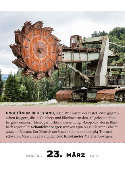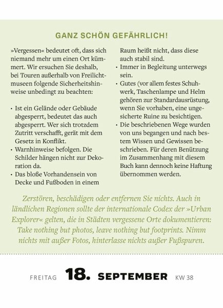 Mit einzigartigen Bildern, Geschichten und Geheimtipps begleitet dieser Abreißkalender alle Lost-Places-Fans auf eine geheimnisvolle Reise zu verlassenen Orten. Ein inspirierender Jahresbegleiter, der die Vergangenheit jeden Tag ein bisschen lebendig werden lässt.