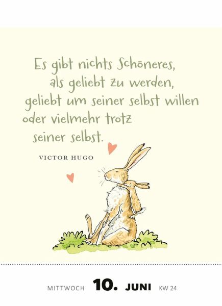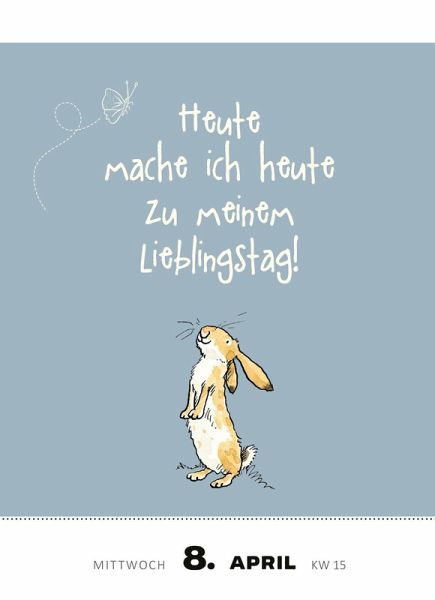 Der weltbekannte Klassiker von Sam McBratney und Anita Jeram bietet hier die Bühne für ein liebevolles Geschenk an unsere Lieblingsmenschen. In diesem Tageskalender mit Seiten zum Abreißen finden sich die schönsten Zeichnungen aus "Weißt du eigentlich, wie lieb ich dich hab?" wieder, kombiniert mit liebevollen Botschaften und Zitaten zu den Themen Zusammenhalt, Liebe, Gelassenheit, Freude und Leben. Es ist ein wundervolles Geschenk für alle, die uns lieb und wichtig sind. Der inspirierende Kalender mit Tageskalendarium lässt sich aufstellen oder aufhängen und ist damit ein toller Blickfang zu Hause im Wohnzimmer, im Regal oder als Schreibtischdeko im Büro.