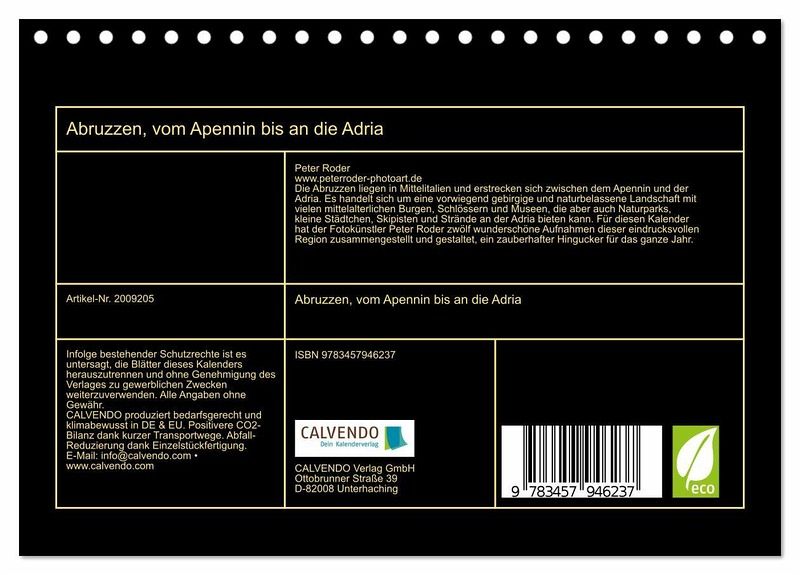 Die Abruzzen liegen in Mittelitalien und erstrecken sich zwischen dem Apennin und der Adria. Es handelt sich um eine vorwiegend gebirgige und naturbelassene Landschaft mit vielen mittelalterlichen Burgen, Schlössern und Museen, die aber auch Naturparks, kleine Städtchen, Skipisten und Strände an der Adria bieten kann. Für diesen Kalender hat der Fotokünstler Peter Roder zwölf wunderschöne Aufnahmen dieser eindrucksvollen Region zusammengestellt und gestaltet, ein zauberhafter Hingucker für das ganze Jahr.