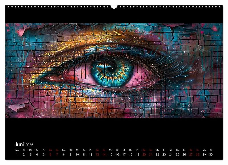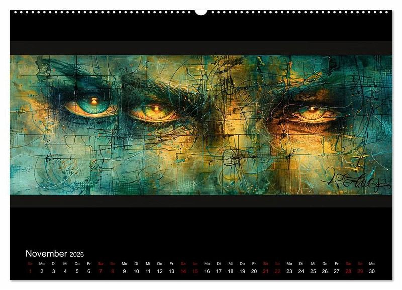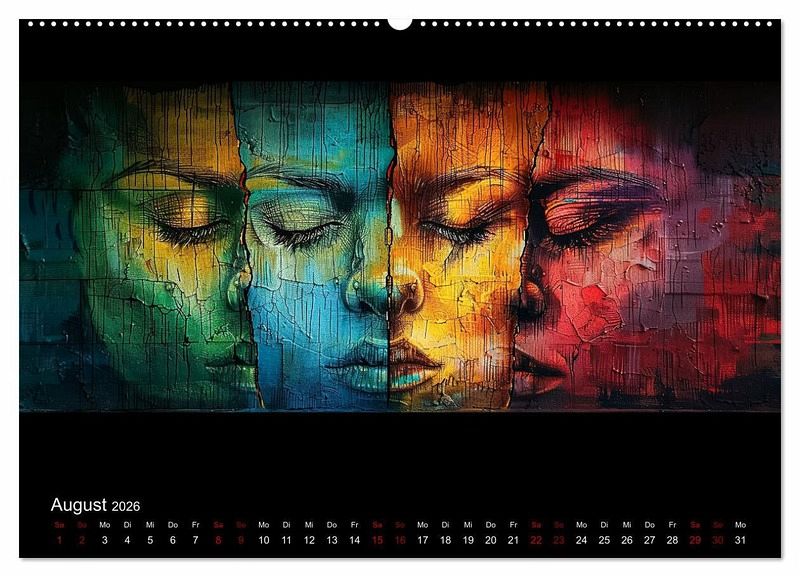 Der einzigartige Kalender ist ein farbliches Feuerwerk vereint mit Elementen der abstrakten Kunst und des Expressionismus. Die intensiven Farben, kräftigen Pinselstriche und die Darstellung der Gesichter, Hände und Figuren erinnern an zeitgenössische Kunst mit Einflüssen aus der Street Art. Die mit Hilfe einer künstlichen Intelligenz erstellten Kunstwerke haben ihren ganz eigenen Charakter. Die geheimnisvolle und ätherische Atmosphäre wird durch die lebendigen Farben mit Positivität kombiniert und die Bilder lassen somit viel Interpretationsmöglichkeiten offen.