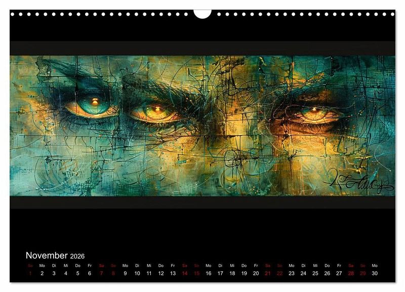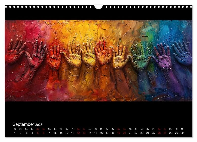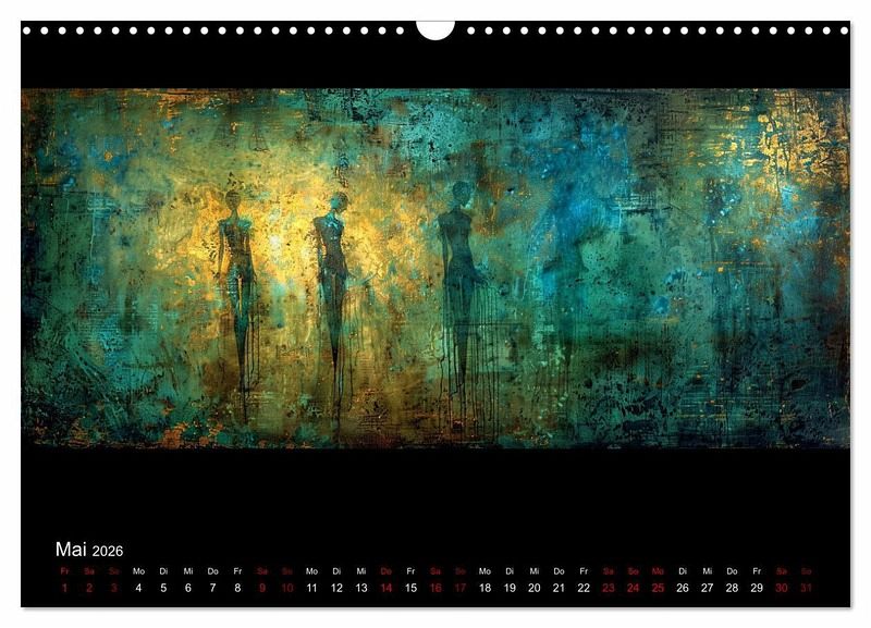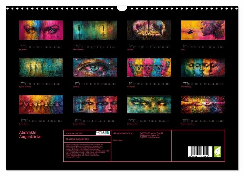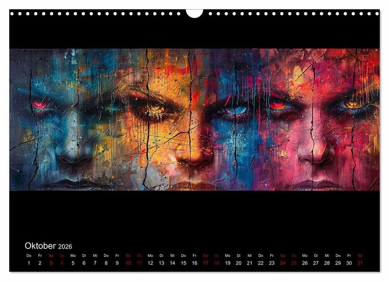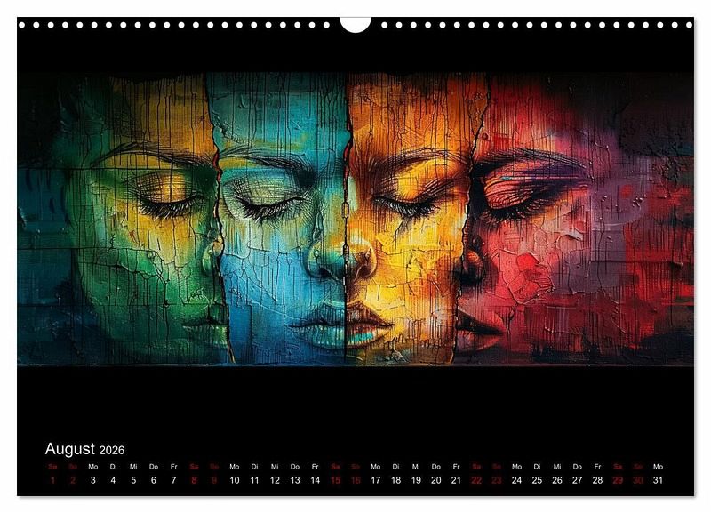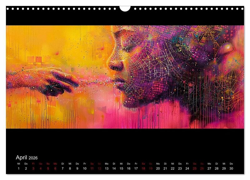 Der einzigartige Kalender ist ein farbliches Feuerwerk vereint mit Elementen der abstrakten Kunst und des Expressionismus. Die intensiven Farben, kräftigen Pinselstriche und die Darstellung der Gesichter, Hände und Figuren erinnern an zeitgenössische Kunst mit Einflüssen aus der Street Art. Die mit Hilfe einer künstlichen Intelligenz erstellten Kunstwerke haben ihren ganz eigenen Charakter. Die geheimnisvolle und ätherische Atmosphäre wird durch die lebendigen Farben mit Positivität kombiniert und die Bilder lassen somit viel Interpretationsmöglichkeiten offen.