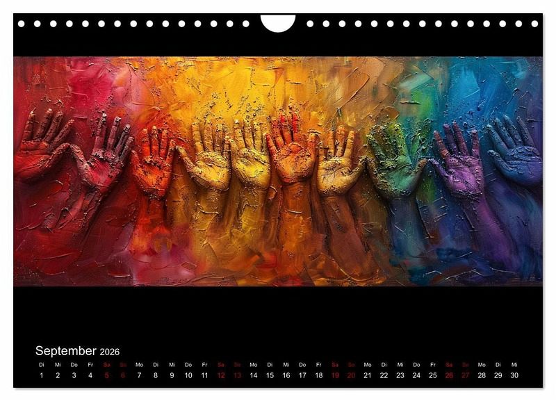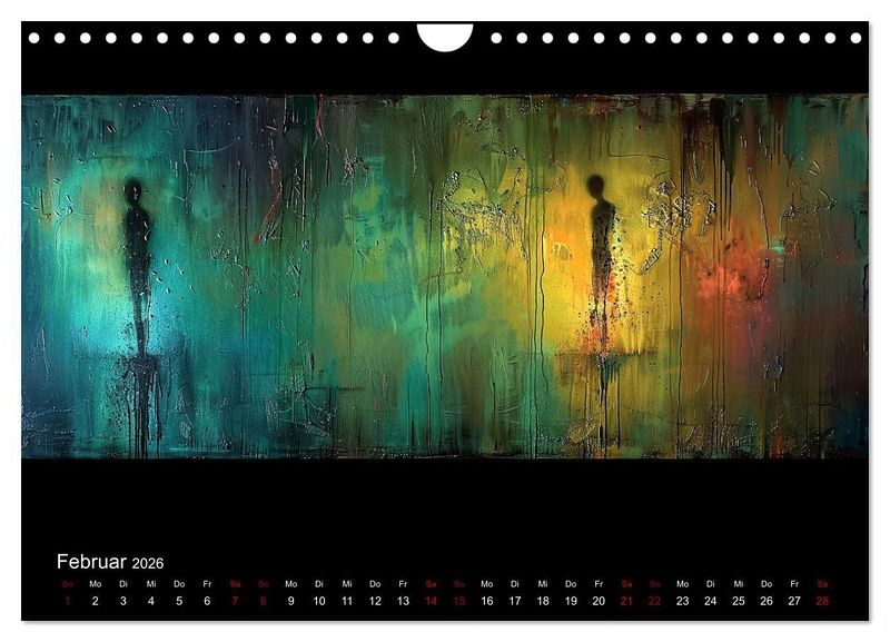 Der einzigartige Kalender ist ein farbliches Feuerwerk vereint mit Elementen der abstrakten Kunst und des Expressionismus. Die intensiven Farben, kräftigen Pinselstriche und die Darstellung der Gesichter, Hände und Figuren erinnern an zeitgenössische Kunst mit Einflüssen aus der Street Art. Die mit Hilfe einer künstlichen Intelligenz erstellten Kunstwerke haben ihren ganz eigenen Charakter. Die geheimnisvolle und ätherische Atmosphäre wird durch die lebendigen Farben mit Positivität kombiniert und die Bilder lassen somit viel Interpretationsmöglichkeiten offen.