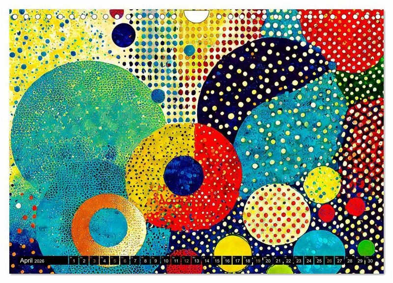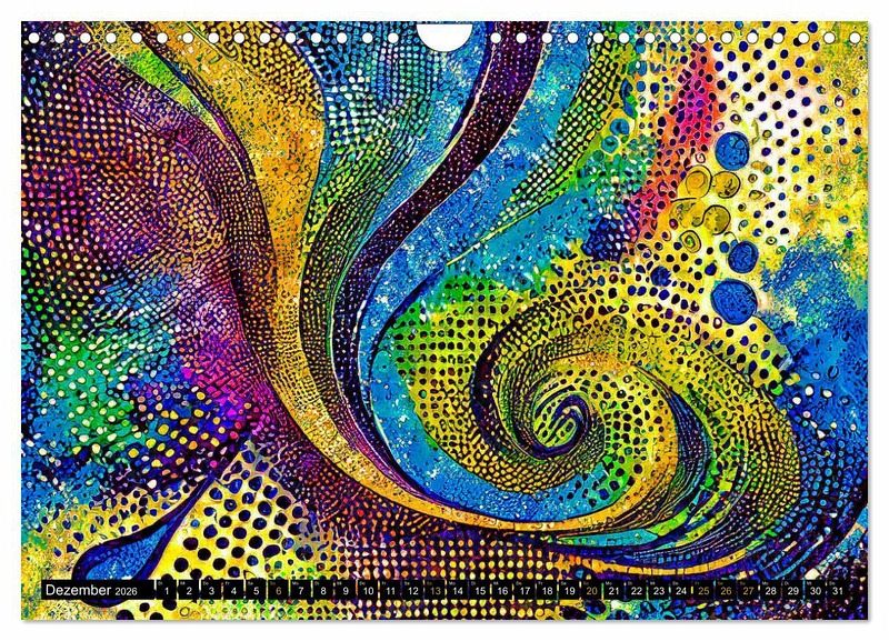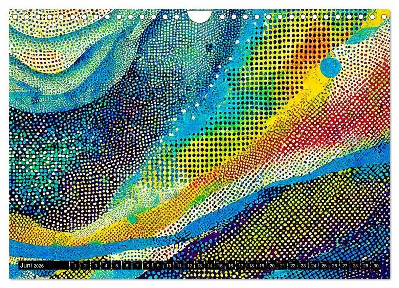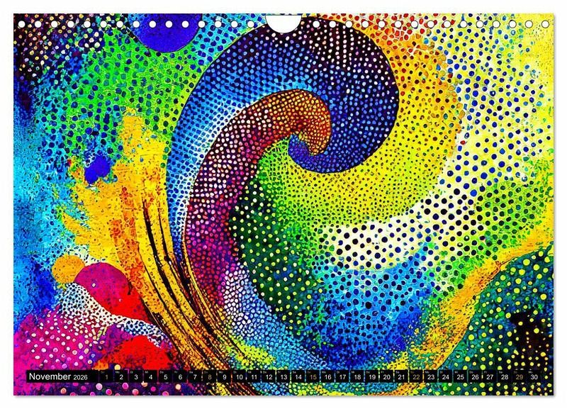 Wir sind es nicht gewohnt, in einer Farbe nur Farbe an sich zu sehen. Wir suchen immer nach etwas, worauf die Farbe hinweist. Sehen wir etwas Rotes, dann kommen uns vielleicht Erdbeeren, Blut, ein Ferrari oder ein Sonnenuntergang in den Sinn, aber kaum die Farbe Rot an sich. Auch auf einer gegenstandslosen Ebene steht Rot für Begriffe wie Wut oder Liebe. Auch wenn künstliche Intelligenz, die maßgeblich an der Entstehung der Bilder dieses Kalenders beteiligt ist, frei ist von solchem Assoziationszwang, wird es der Betrachter der Bilder vermutlich nicht sein. Ob Sie nun mit den Bildern etwas verbinden oder ob Sie die dekorative Qualität der Farben und Formen an sich wertschätzen, genießen Sie Monat für Monat die abstrakte Farbdynamik der Monatsbilder.