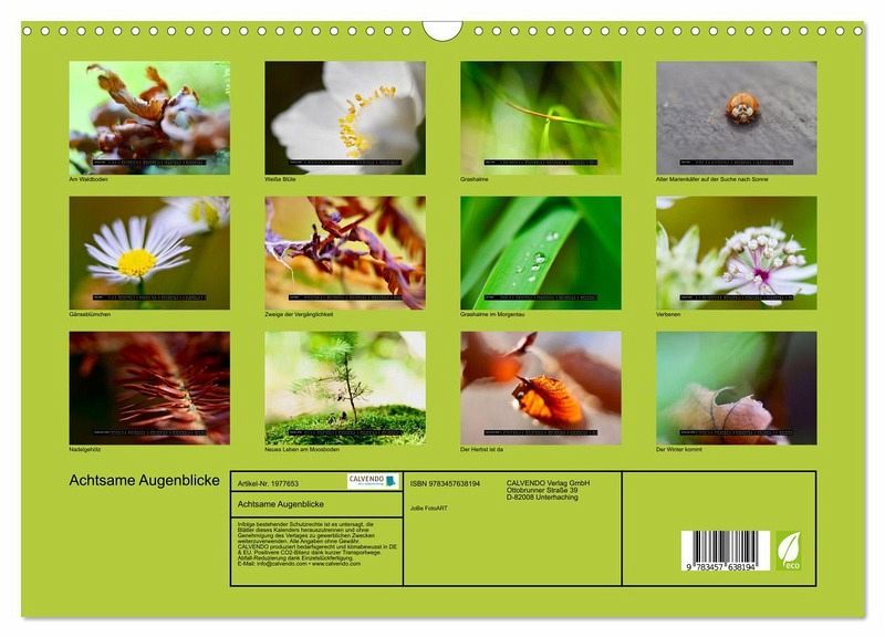 QUALITÄT - Hochwertiger Fotokalender mit 12 wunderschönen Motiven auf lichtbeständigem Bilderdruckpapier, robuste Spiralbindung mit Aufhängebügel.NACHHALTIG - deutliche Abfallreduzierung durch bedarfsgerechte Einzelstückfertigung, umweltfreundliches FSC-zertifiziertes Papier, Produktion in Deutschland, klimabewusste Logistik.PERFEKTES GESCHENK - Kalender für Freunde und Familie, für Kinder und Erwachsene, jung und alt, zu Weihnachten, Geburtstag oder zwischendurch.VIELFALT - Bildkalender in verschiedenen Formaten, z.B. DIN A5, DIN A4, DIN A3 sowie DIN A2. Ob Naturmotiv, Gemälde oder Fotos, ideal für ein persönliches Wohlfühlambiente.Bewusste achtsame Fotografie aus der Natur - schlicht und ergreifend von Autor(in): JoBe Fotografie