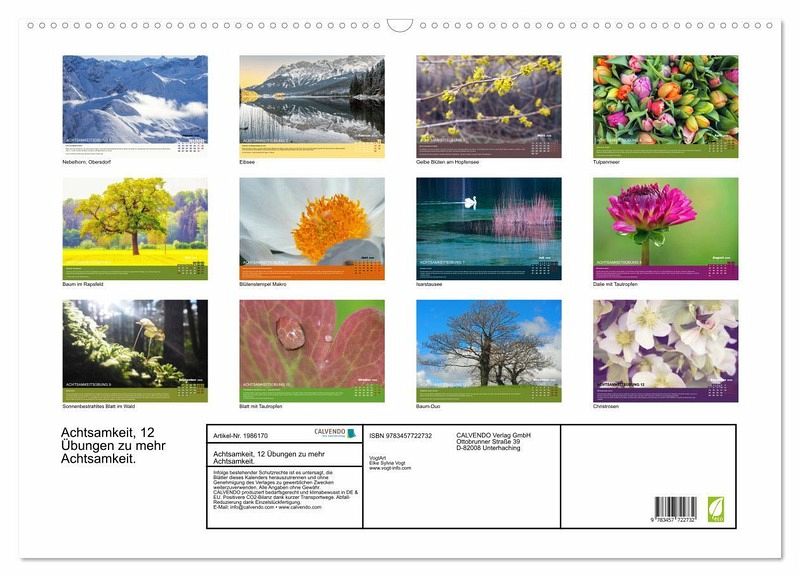 QUALITÄT - Hochwertiger Fotokalender mit 12 wunderschönen Motiven auf lichtbeständigem Bilderdruckpapier, robuste Spiralbindung mit Aufhängebügel.NACHHALTIG - deutliche Abfallreduzierung durch bedarfsgerechte Einzelstückfertigung, umweltfreundliches FSC-zertifiziertes Papier, Produktion in Deutschland, klimabewusste Logistik.PERFEKTES GESCHENK - Kalender für Freunde und Familie, für Kinder und Erwachsene, jung und alt, zu Weihnachten, Geburtstag oder zwischendurch.VIELFALT - Bildkalender in verschiedenen Formaten, z.B. DIN A5, DIN A4, DIN A3 sowie DIN A2. Ob Naturmotiv, Gemälde oder Fotos, ideal für ein persönliches Wohlfühlambiente.12 monatliche Übungen für mehr Achtsamkeit und mehr Entspannung. von Autor(in): VogtArt