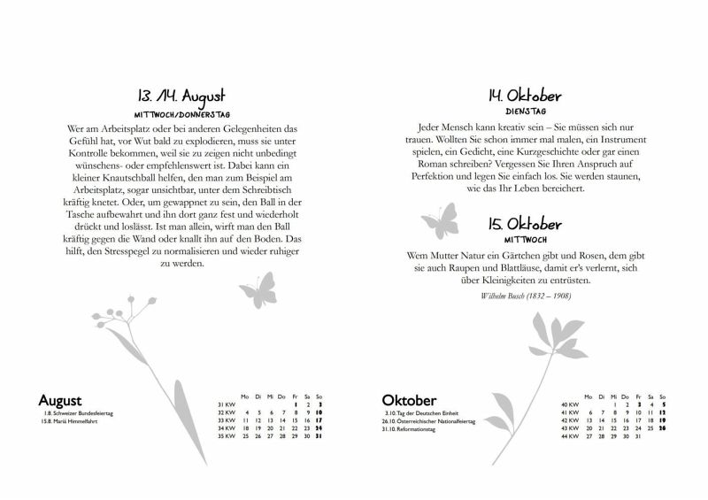 Um die Alltagsprobleme besser bewältigen zu können, wünschen sich viele mehr Gelassenheit. Achtsamkeit ist ein wunderbarer Weg, um auch bei Stress und hohen Anforderungen entspannt zu reagieren oder zu bleiben.Tag für Tag bietet dieser Kalender Anregungen, Übungen und Aphorismen, die eine bessere seelische Balance ermöglichen und die zu einer entspannten Akzeptanz des täglichen Lebens und mehr Achtsamkeit in allen Bereichen führen.