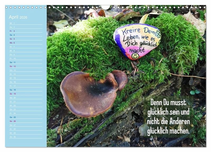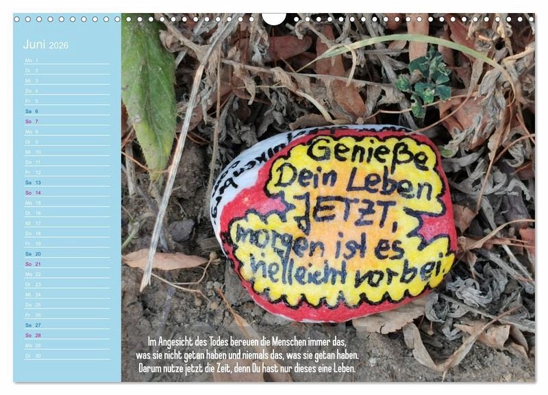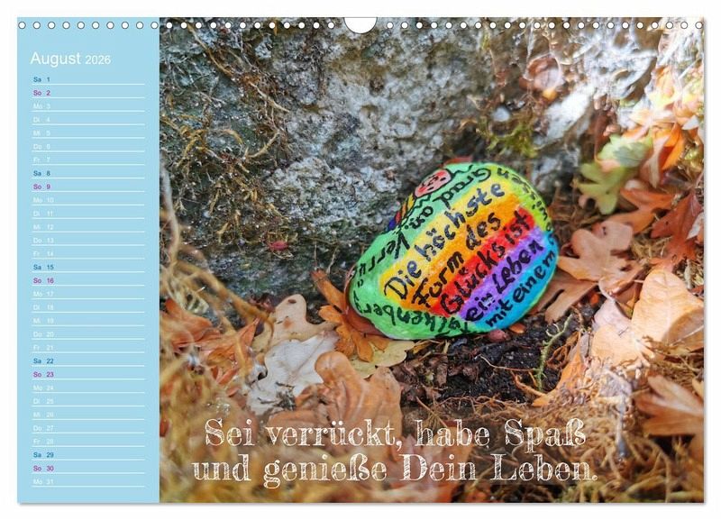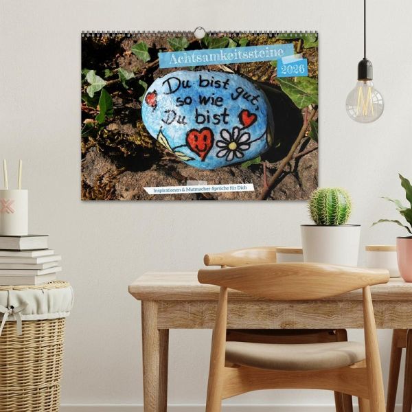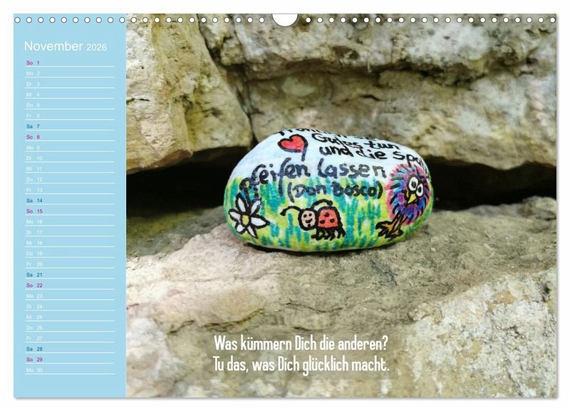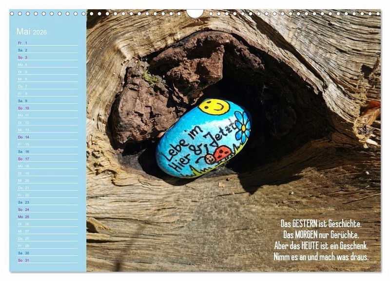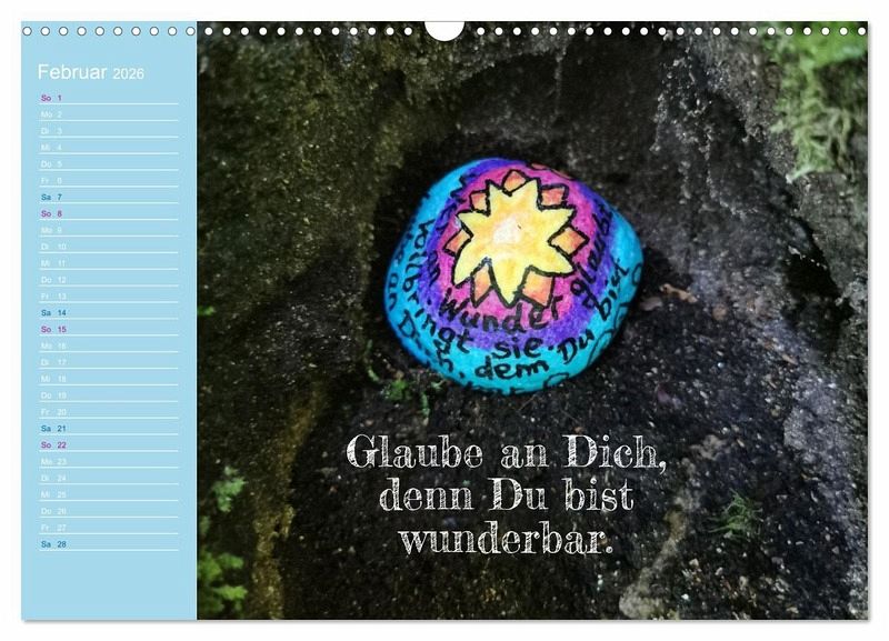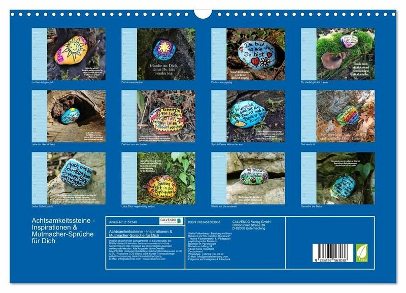 Dieser besondere Kalender verbindet kunstvolle Fotografien handbemalter Achtsamkeitssteine mit inspirierenden Sprüchen, die Dich durch das Jahr begleiten. Jede Monatsseite lädt zum Innehalten ein, schenkt Dir Momente der Gelassenheit und neue Impulse für Deinen Alltag. Ob Zuhause, im Büro oder als liebevolles Geschenk - die harmonische Verbindung von Bild und Wort schafft kleine Oasen der Ruhe und Lebensfreude. Ein Kalender, der nicht nur die Zeit sichtbar macht, sondern Herz und Seele berührt - Monat für Monat.