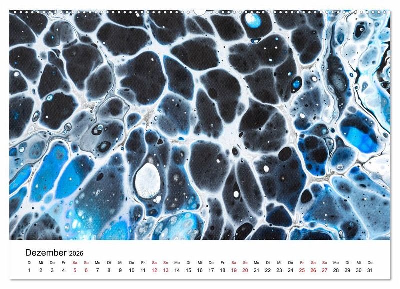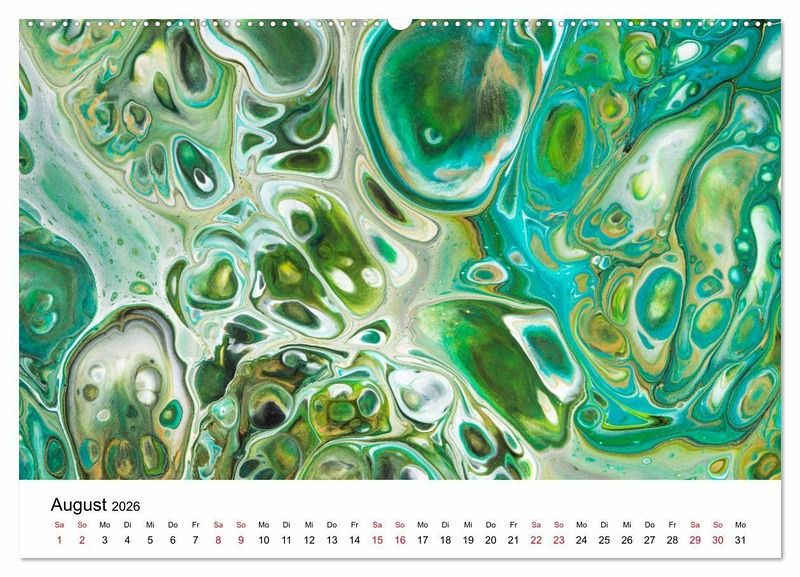 Zwölf einzigartige, farbenprächtige Ausschnitte aus Acrylic-Pouring-Gemälden von Carola Vahldiek machen jedes Kalenderblatt zu einem echten Hingucker und einer wunderschönen Wanddekoration.