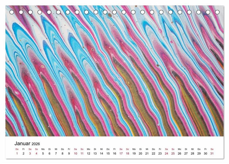 Zwölf einzigartige, farbenprächtige Ausschnitte aus Acrylic-Pouring-Gemälden von Carola Vahldiek machen jedes Kalenderblatt zu einem echten Hingucker und einer wunderschönen Wanddekoration.