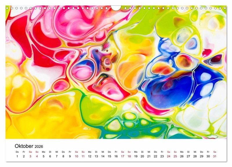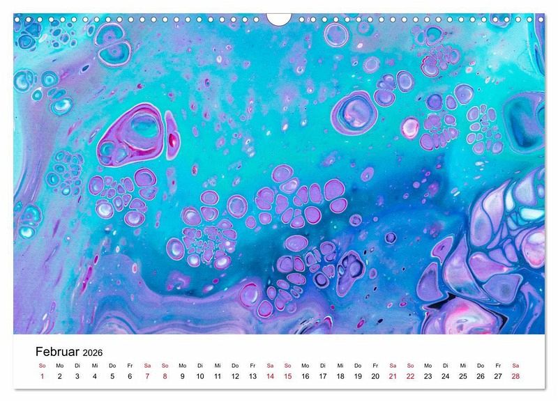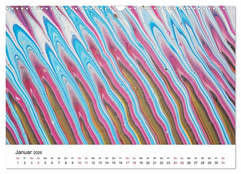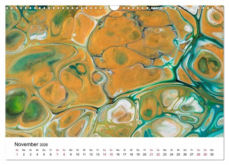 Zwölf einzigartige, farbenprächtige Ausschnitte aus Acrylic-Pouring-Gemälden von Carola Vahldiek machen jedes Kalenderblatt zu einem echten Hingucker und einer wunderschönen Wanddekoration.