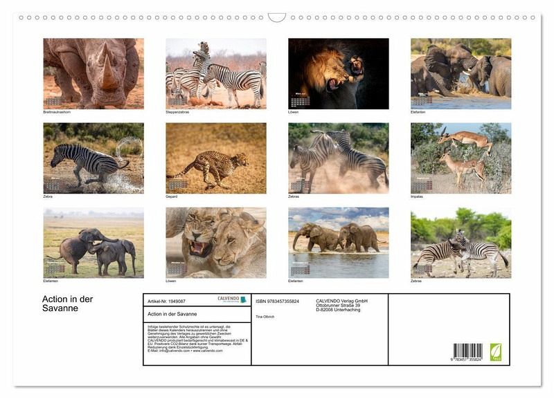 QUALITÄT - Hochwertiger Fotokalender mit 12 wunderschönen Motiven auf lichtbeständigem Bilderdruckpapier, robuste Spiralbindung mit Aufhängebügel.NACHHALTIG - deutliche Abfallreduzierung durch bedarfsgerechte Einzelstückfertigung, umweltfreundliches FSC-zertifiziertes Papier, Produktion in Deutschland, klimabewusste Logistik.PERFEKTES GESCHENK - Kalender für Freunde und Familie, für Kinder und Erwachsene, jung und alt, zu Weihnachten, Geburtstag oder zwischendurch.VIELFALT - Bildkalender in verschiedenen Formaten, z.B. DIN A5, DIN A4, DIN A3 sowie DIN A2. Ob Naturmotiv, Gemälde oder Fotos, ideal für ein persönliches Wohlfühlambiente.Afrikas Tiere in voller Aktion von Autor(in): Tina Olbrich