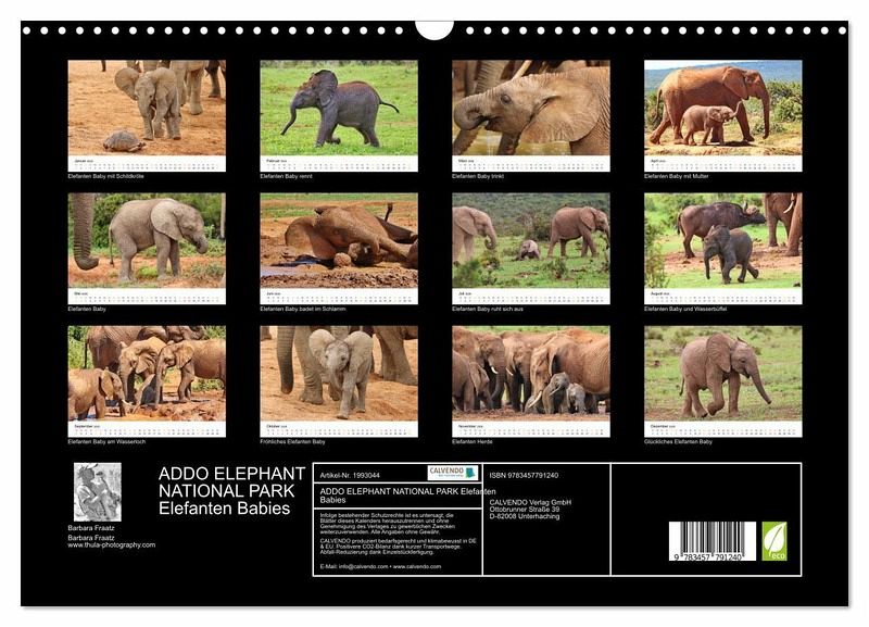 QUALITÄT - Hochwertiger Fotokalender mit 12 wunderschönen Motiven auf lichtbeständigem Bilderdruckpapier, robuste Spiralbindung mit Aufhängebügel.NACHHALTIG - deutliche Abfallreduzierung durch bedarfsgerechte Einzelstückfertigung, umweltfreundliches FSC-zertifiziertes Papier, Produktion in Deutschland, klimabewusste Logistik.PERFEKTES GESCHENK - Kalender für Freunde und Familie, für Kinder und Erwachsene, jung und alt, zu Weihnachten, Geburtstag oder zwischendurch.VIELFALT - Bildkalender in verschiedenen Formaten, z.B. DIN A5, DIN A4, DIN A3 sowie DIN A2. Ob Naturmotiv, Gemälde oder Fotos, ideal für ein persönliches Wohlfühlambiente.Addo Elephant National Park ist der 3. Größte National Park in Südafrika. Die Fotografin Barbara Fraatz zeigt in diesem hochwertigen Fotojahreskalender fazinierende Aufnahmen von Elefanten Babies im Addo. von Autor(in): Thula