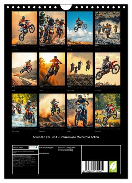 QUALITÄT - Hochwertiger Fotokalender mit 12 wunderschönen Motiven auf lichtbeständigem Bilderdruckpapier, robuste Spiralbindung mit Aufhängebügel.NACHHALTIG - deutliche Abfallreduzierung durch bedarfsgerechte Einzelstückfertigung, umweltfreundliches FSC-zertifiziertes Papier, Produktion in Deutschland, klimabewusste Logistik.PERFEKTES GESCHENK - Kalender für Freunde und Familie, für Kinder und Erwachsene, jung und alt, zu Weihnachten, Geburtstag oder zwischendurch.VIELFALT - Bildkalender in verschiedenen Formaten, z.B. DIN A5, DIN A4, DIN A3 sowie DIN A2. Ob Naturmotiv, Gemälde oder Fotos, ideal für ein persönliches Wohlfühlambiente.Vollgas durchs Jahr mit Motocross pur. von Autor(in): Michaela Spreider