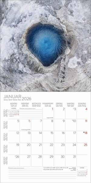Hochwertig und ohne Plastikfolie verpacktWandkalender im Format: 30 x 30 cm; Offenes Format: 30 x 60 cm; umweltfreundliches FSC PapierJede Kalenderseite mit großem Bild und viel Platz im Kalendarium für Notizen und TermineMehrsprachiges Kalendarium: DE/GB/FR/IT/ES mit Feiertagen für D/A/CH/GB/FR/IT/ESRegionale Ferienzeiten für DE/A/CHMonatsübersicht für den jeweiligen Vor- und Nachmonat; Jahresübersicht