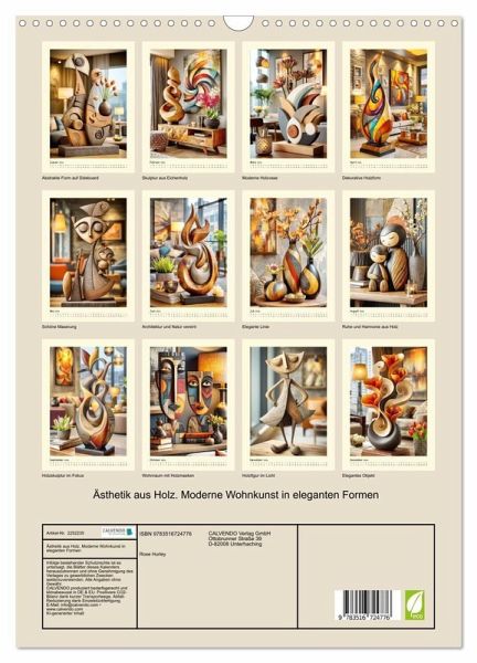 Dieser Kalender zeigt die Schönheit moderner Wohnkultur, in der Holz eine Rolle spielt. Jedes Bild wurde mit der Hilfe von KI erstellt und fängt die warme Ausstrahlung und natürliche Struktur des Materials ein - von eleganten Skulpturen bis zu minimalistischen Vasen. Die Kombination aus Design und Natur schafft eine Atmosphäre von Ruhe, Stil und Behaglichkeit. Perfekt für alle, die Wohnästhetik, Handwerkskunst und natürliche Materialien lieben.