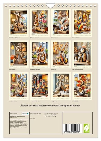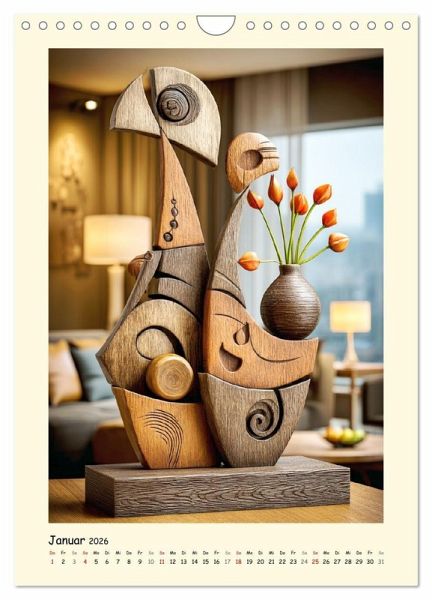 Dieser Kalender zeigt die Schönheit moderner Wohnkultur, in der Holz eine Rolle spielt. Jedes Bild wurde mit der Hilfe von KI erstellt und fängt die warme Ausstrahlung und natürliche Struktur des Materials ein - von eleganten Skulpturen bis zu minimalistischen Vasen. Die Kombination aus Design und Natur schafft eine Atmosphäre von Ruhe, Stil und Behaglichkeit. Perfekt für alle, die Wohnästhetik, Handwerkskunst und natürliche Materialien lieben.