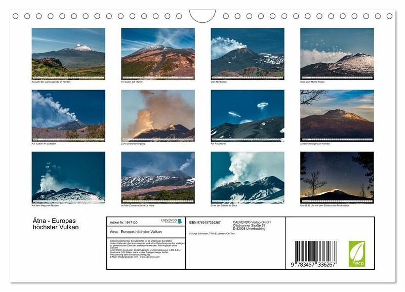 Ursprünglich planten Sonja Schlichter und ihr Mann lediglich, den Ätna an diesem Tag zu umrunden, da sie ihn bereits vor Jahren besucht hatten. Doch als sie ihr Lager aufschlugen, wurden sie von diesem wunderschönen Vulkan überrascht. Es schien, als würde der Ätna atmen. In einem rhythmischen Stakkato blies er Wirbelringe in die Luft, als wolle er Aufmerksamkeit erregen. Glühende Rauchschwaden formten sich zu perfekten Ringen, die langsam emporstiegen, um mit dem Himmel zu verschmelzen. Daraufhin beschloss die Autorin, den Vulkan in einer mehrtägigen Reise zu umrunden, um die Schönheit des Ätna in all ihren Facetten einzufangen. Die Ergebnisse dieser Expedition präsentiert sie nun stolz in diesem außergewöhnlichen Kalender.