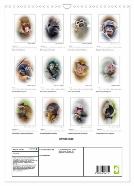 QUALITÄT - Hochwertiger Fotokalender mit 12 wunderschönen Motiven auf lichtbeständigem Bilderdruckpapier, robuste Spiralbindung mit Aufhängebügel.NACHHALTIG - deutliche Abfallreduzierung durch bedarfsgerechte Einzelstückfertigung, umweltfreundliches FSC-zertifiziertes Papier, Produktion in Deutschland, klimabewusste Logistik.PERFEKTES GESCHENK - Kalender für Freunde und Familie, für Kinder und Erwachsene, jung und alt, zu Weihnachten, Geburtstag oder zwischendurch.VIELFALT - Bildkalender in verschiedenen Formaten, z.B. DIN A5, DIN A4, DIN A3 sowie DIN A2. Ob Naturmotiv, Gemälde oder Fotos, ideal für ein persönliches Wohlfühlambiente.Unterschiedlichste Affensichter von Autor(in): Claudia Kleemann